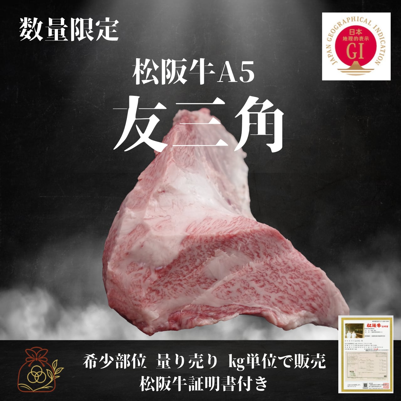 この松阪牛友三角は、特別な部位から得られる非常に貴重な肉です。特別なシーンでの豪華なお食事に、ぜひお試しいただきたい逸品です。この機会をお見逃しなく!